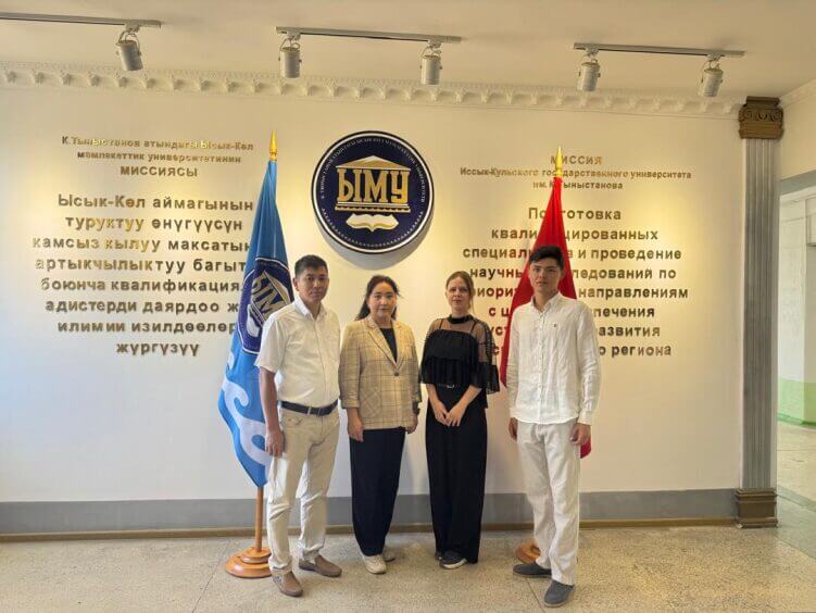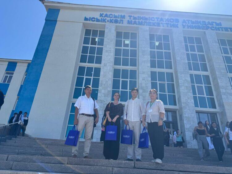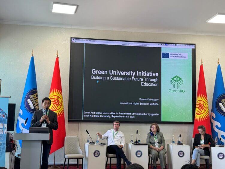 Иссык-Куль, 1 сентября 2025 года — Сотрудники Кыргызской государственной медицинской академии имени И.К. Ахунбаева (КГМА) в лице доцента кафедры общей гигиены Султашева А.Ж., заведующей ОМС Юсуповой Т.Б., декана факультета медицинской инженерии Богомолец К.Ю., и студента 6 курса Лечебное дело Шадыбекова А., принимают активное участие в международной научной конференции, организованной Иссык-Кульским государственным университетом имени Касыма Тыныстанова (ИГУ) в рамках проекта Erasmus+ «Зелёные и цифровые университеты для устойчивого развития Кыргызстана» (Green KG).