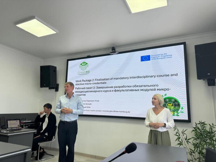 30 сентября 2024 года в Гамбургском университете прикладных наук, Германия стартовал обучающий семинар в рамках проекта GREENKG “Зеленые и цифровые университеты для устойчивого развития Кыргызстана” программы ERASMUS+ Европейского Союза. Приветствовал участников Вице-Президент HAW Профессор Питер Вульф. Далее были лекции по использованию Moodle, по возможностям для проведения исследований и создания сетей по вопросам устойчивого развития. И завершился первый день обсуждением заданий для вузов по созданию зеленых и цифровых офисов с профессором Мариной Троппман.