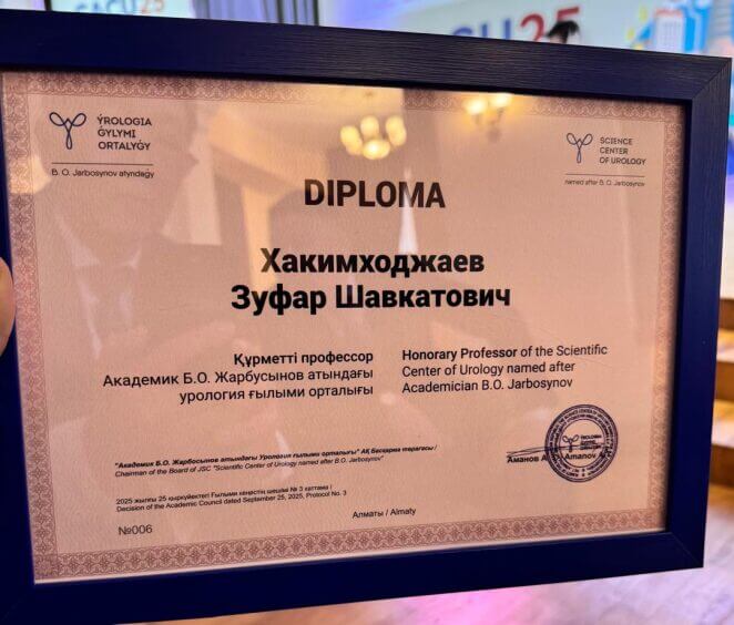 На открытии Конгресса доценту Зуфар Шавкатовичу Хакимходжаеву за большой вклад в развитие урологии в Центрально-азиатском регионе, был вручен диплом Почетного Профессора Научного Центра Урологии им. Б.У. Джарбусынов, флагмана урологии в Республике Казахстан.